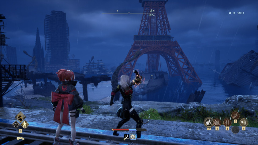 Локация «Затопленный город» напоминает о NieR: Automata — здесь так же атмосферно, кругом разрушенные мосты и искорёженные ленты шоссе, ржавые остовы машин, мрачные руины с вывесками и прочими следами былой жизни. Везде полно деталей, во многие дома можно зайти. И очень много вертикальности — есть холмы и низины, у самой воды среди затопленных зданий возвышается даже местная Эйфелева башня. По шоссе бродят твари, которых так приятно сбивать на своём байке. Среди них через какое-то время появляются новые, огромные и очень опасные, — и они начинают сражаться между собой. В этом смысле игра мне напомнила Horizon и даже Monster Hunter, потому что на этих бродячих чудищ начинаешь специально охотиться.