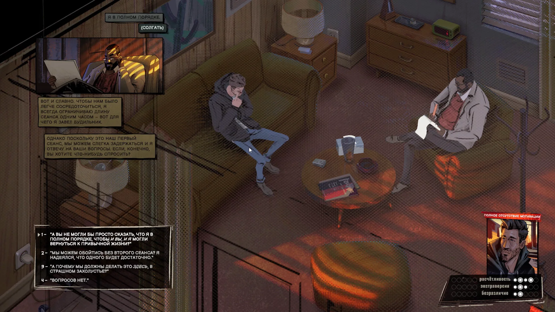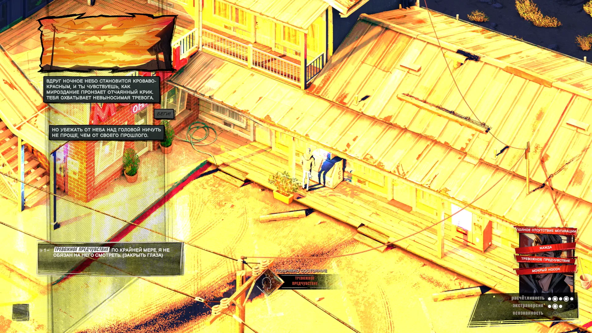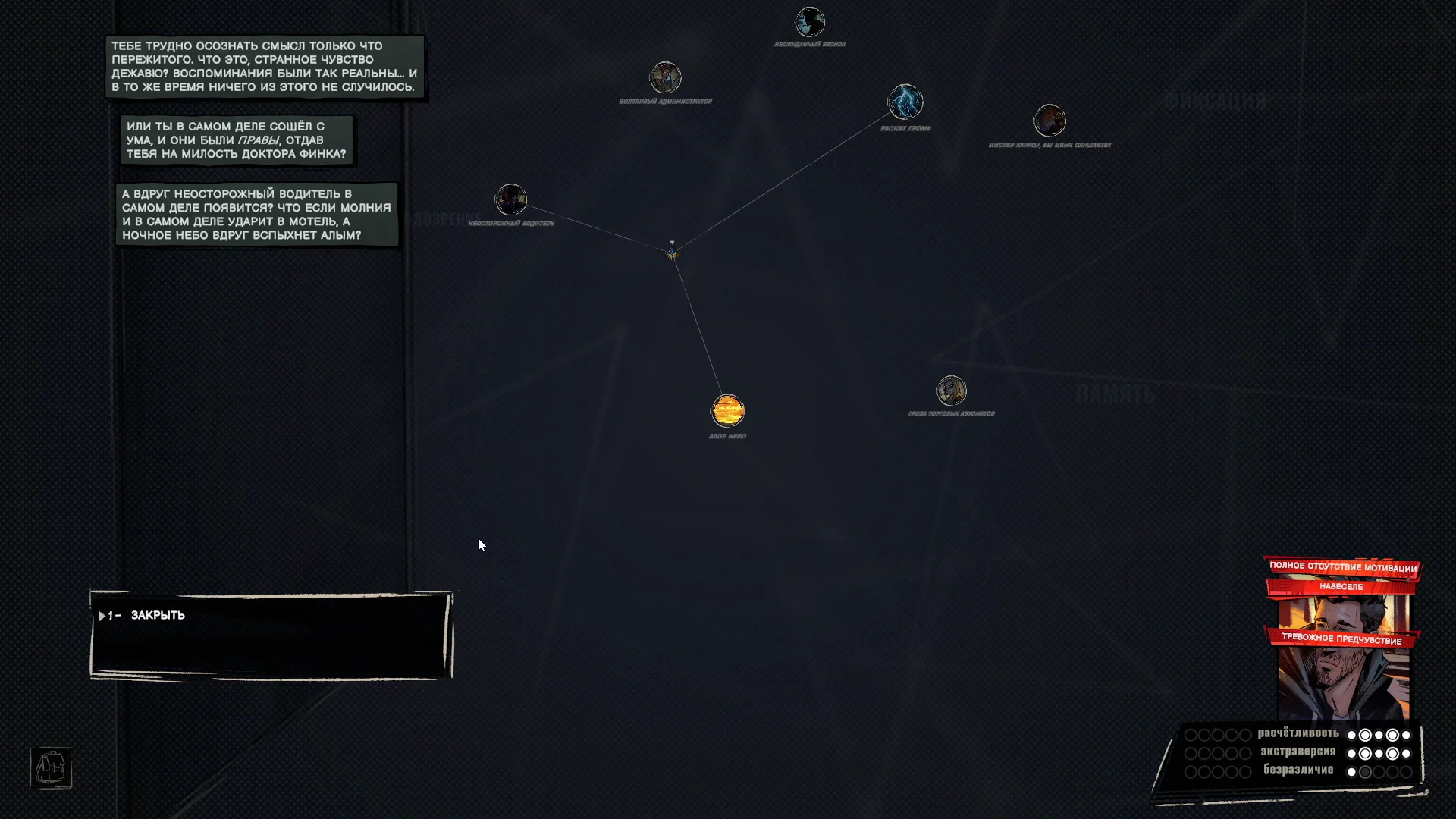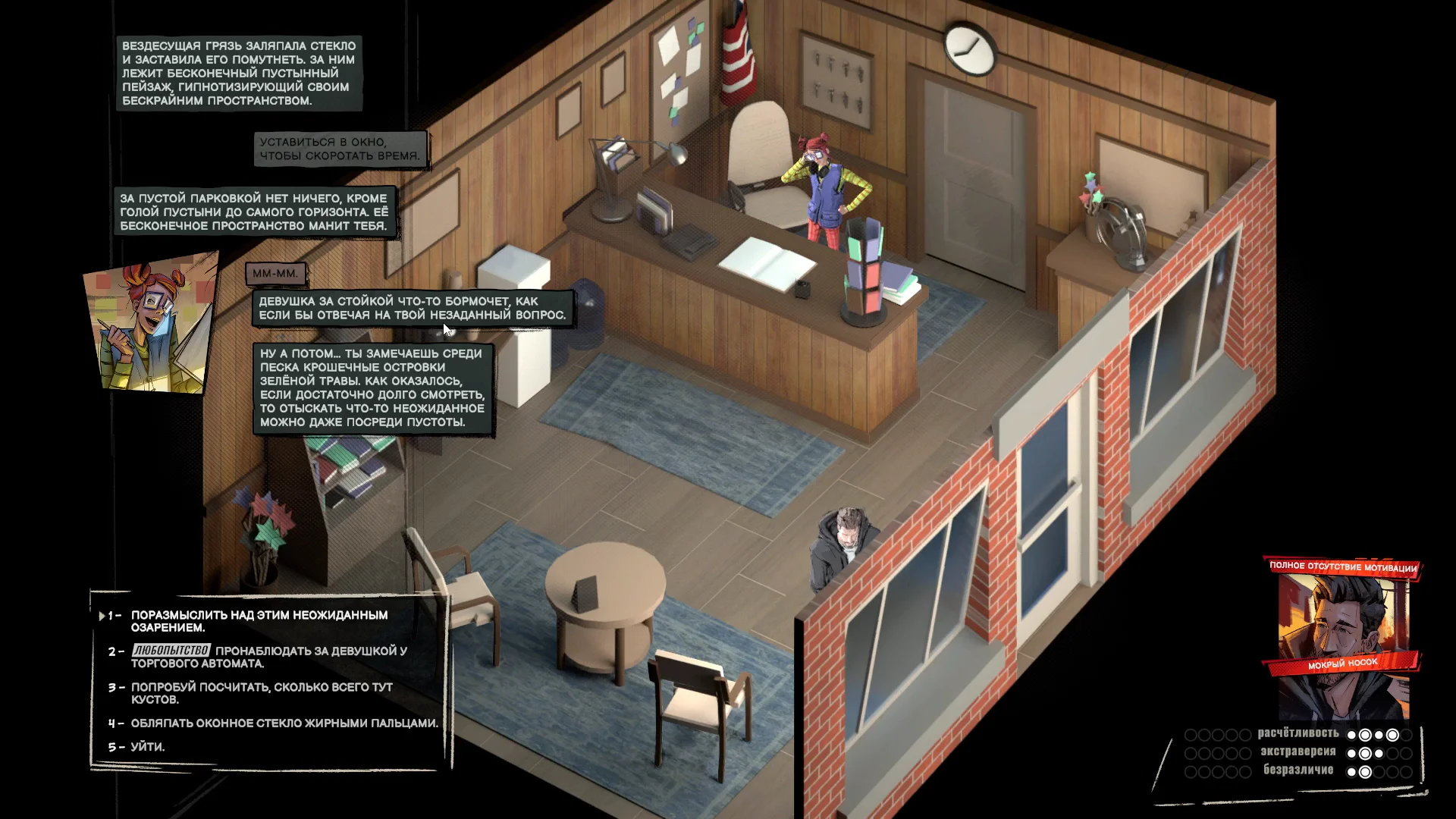 Кроме того, черты характера влияют на мысли, которые отображаются слева сверху. То есть та же паранойя не только открывает дополнительные возможности (или лишает выбора), но и создаёт фон — чтобы лучше понимать чувства персонажа в данный момент.