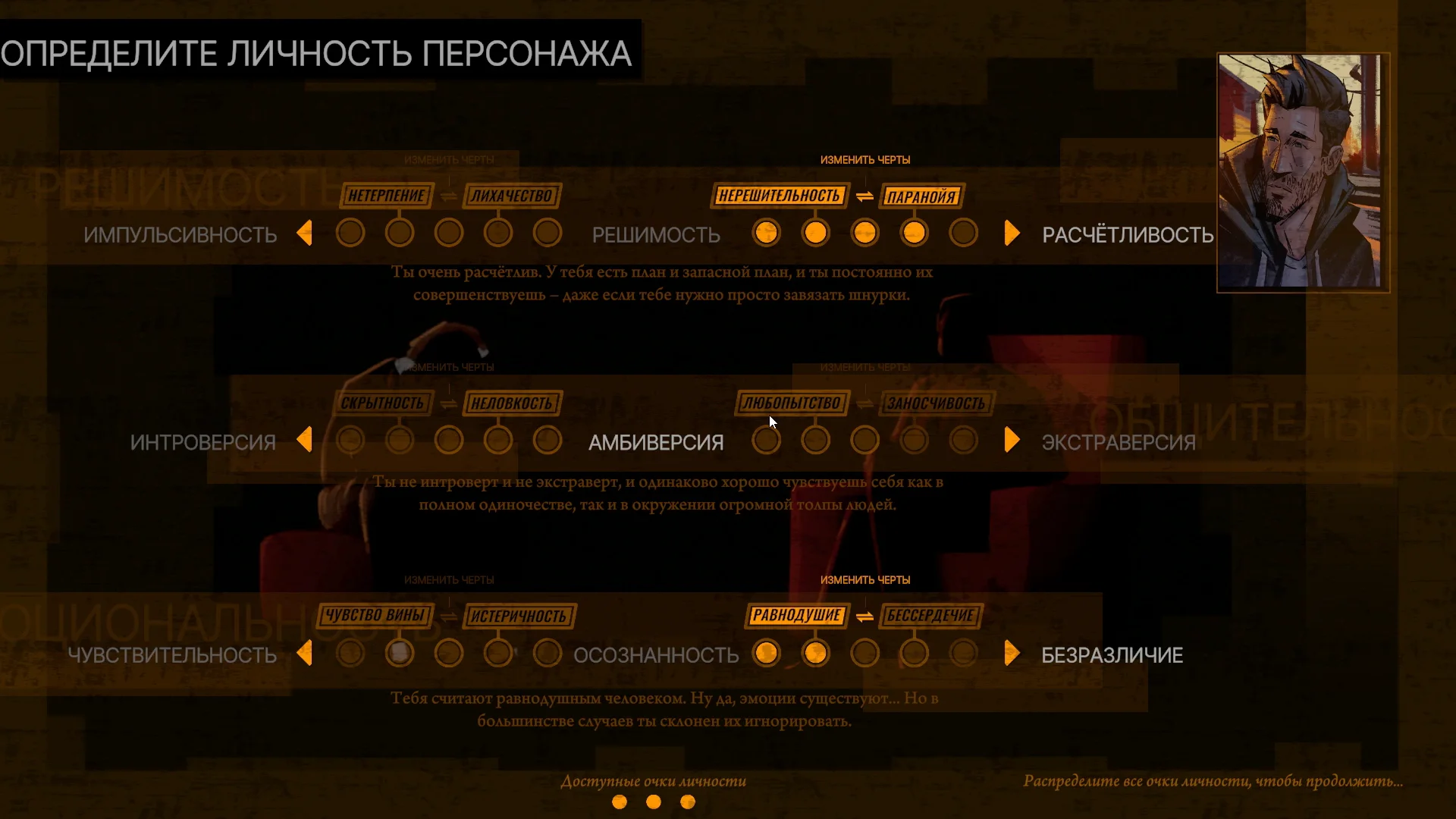 Ролевая игра начинается с создания личности персонажа. За кого мы будем играть? Будет наш герой экспрессивным или холодным? Экстравертом или интровертом? Действовать исходя из сиюминутных желаний или расчёта?.. Распределение очков в самом начале позволит заложить лишь стартовые показатели персонажа. По ходу игры (исходя из наших поступков и происходящих событий) герой может и будет меняться в ту или иную сторону.