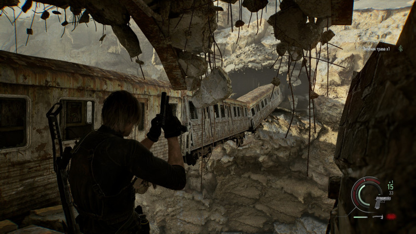 Что до Леона, то у него тоже есть свой крафт, но уже не из жидкости, а в духе старых Resident Evil — из пороха. У второго героя и арсенал оружия шире, и инвентарь гораздо больше, поэтому ему нет нужды постоянно складывать лишнее в ящик (им может пользоваться только Грейс). Трекер на запястье начисляет Леону очки (опять-таки отсылка, но уже к более свежим частям франшизы), и затем, в перерывах между боями, в специальных контейнерах с припасами он может покупать новое оружие, улучшения для него и броню.
