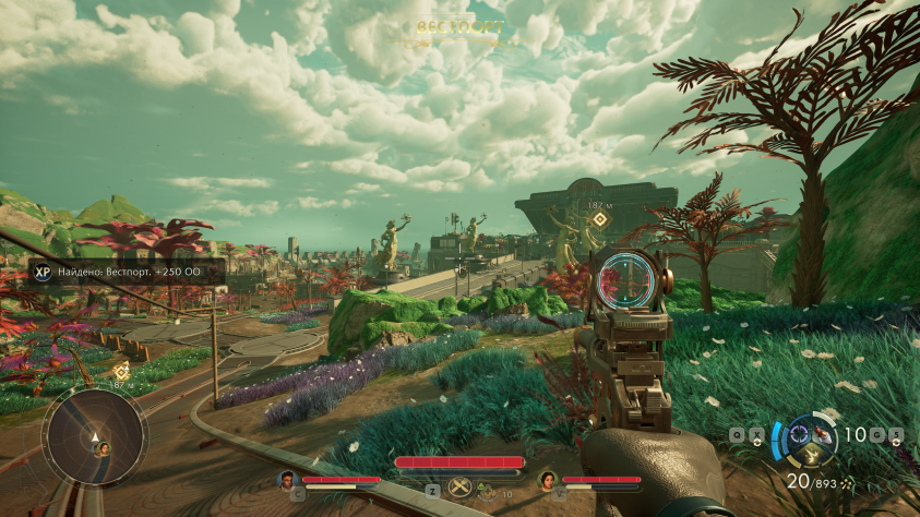 Правда, Эдем не произвёл на меня приятного впечатления — все эти яркие, вырвиглазные цвета, ставшие визитной карточкой The Outer Worlds, не нравились мне и в первой части. Но по мере исследования героям повстречаются и очень красивые планеты. Погружению поспособствовала музыка, написанная специально для игры, — песни оказались настолько хороши, что уже через пару часов я стала ходячим рекламным модулем для всякой всячины, которую продаёт корпорация, и напеваю весь этот ужас до сих пор.